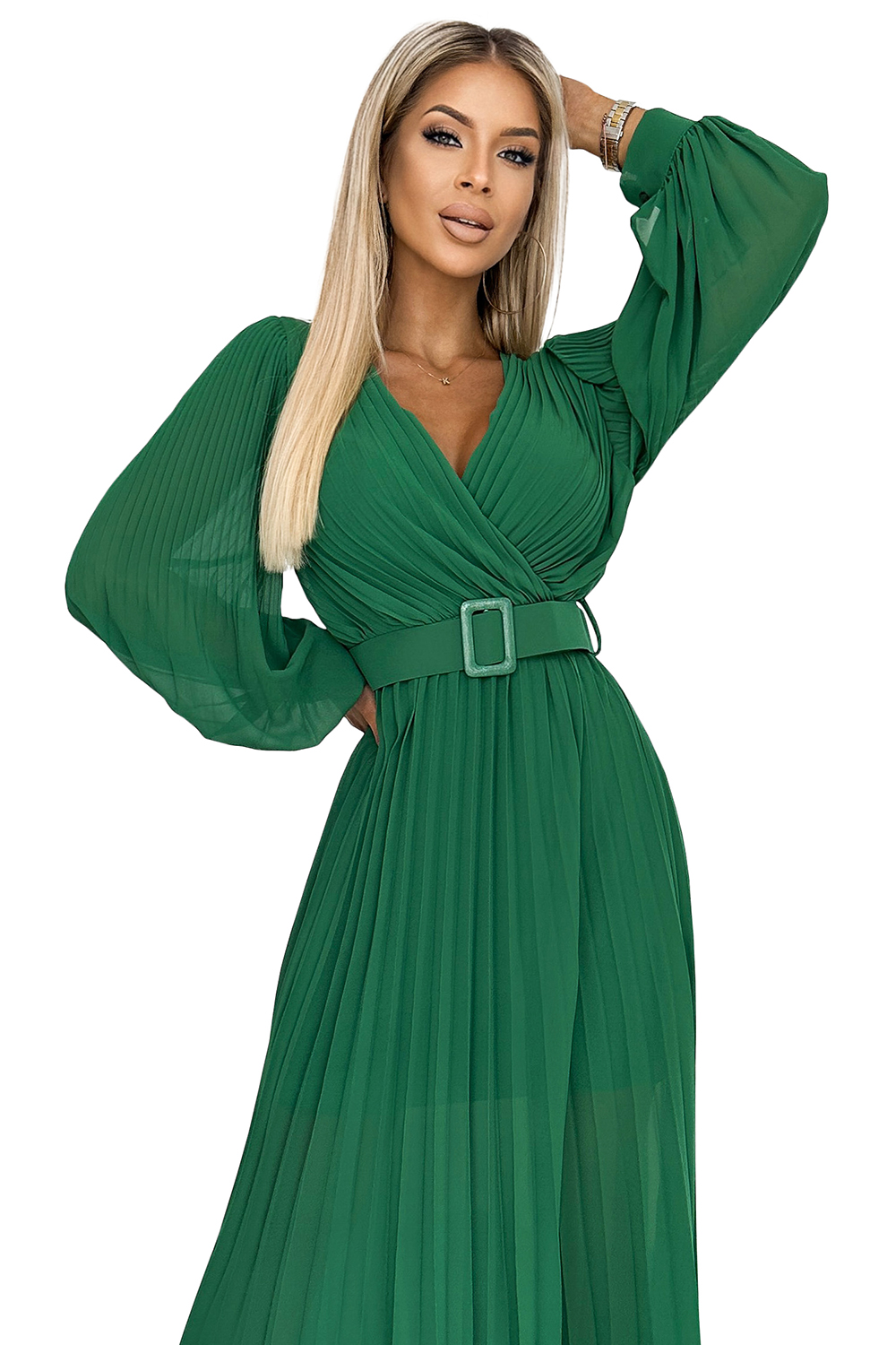 414-3 KLARA rochie plisată cu centură și decolteu - VERDE DESCHIS