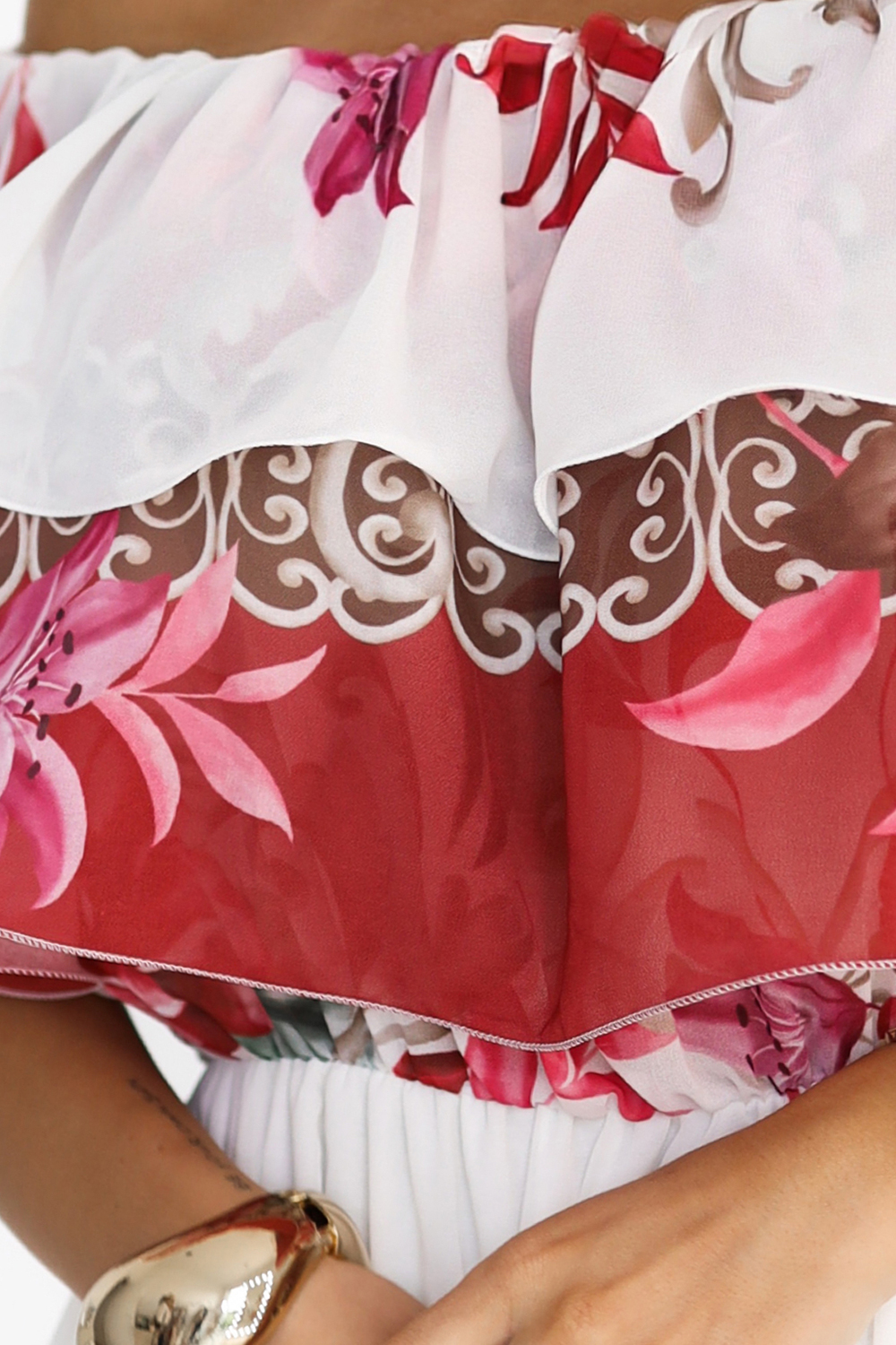 Descoperă farmecul feminin și ușurința datorită acestei rochii maxi excepționale în stil spaniol. Partea de sus ornamentată cu volang expune frumos umerii, iar partea de jos vaporoasă cu print floral creează un efect ombre și atrage privirile.