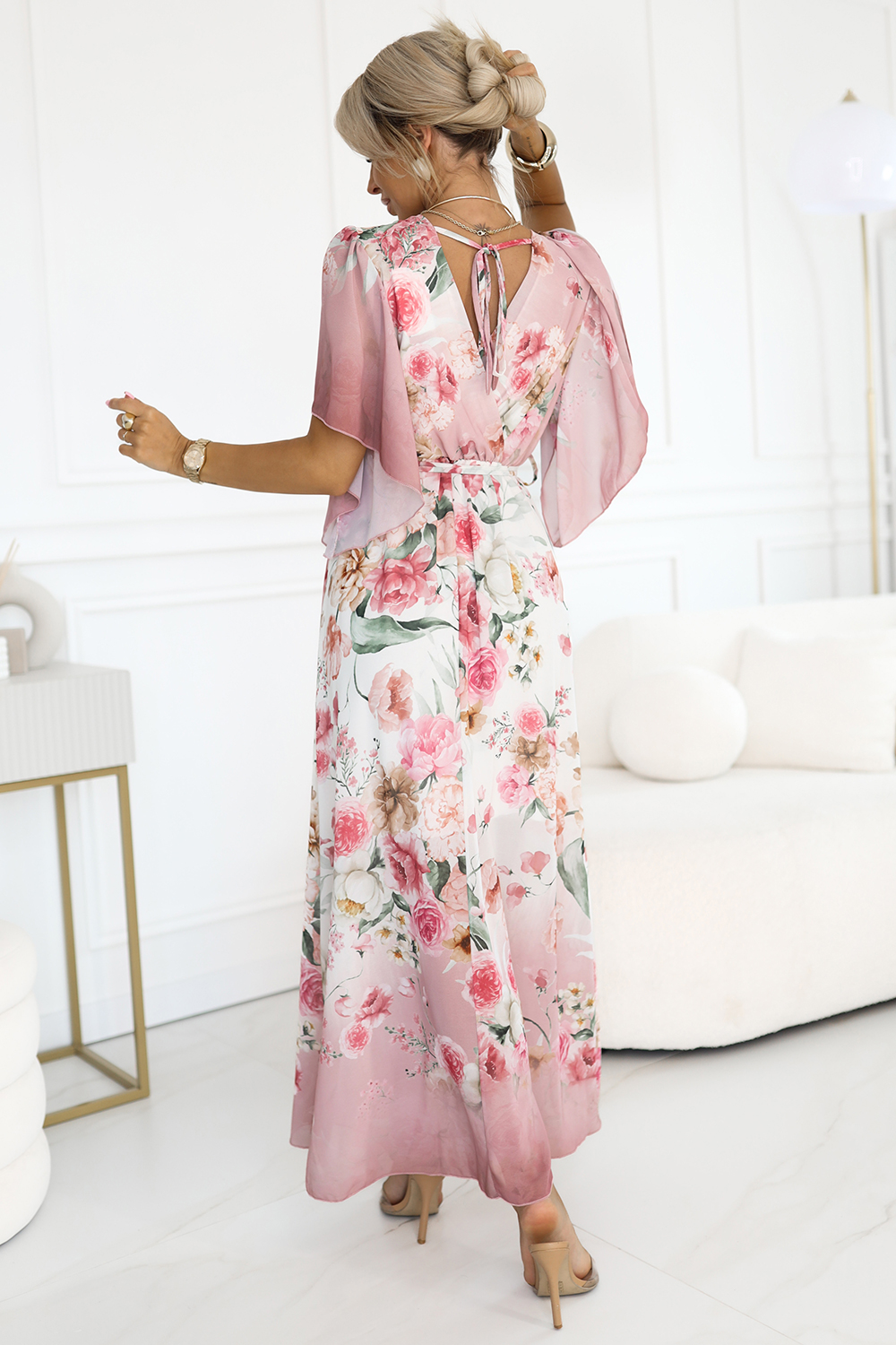 603-4 Rochie maxi vaporoasă, înfășurată, cu model floral - trandafiri roz