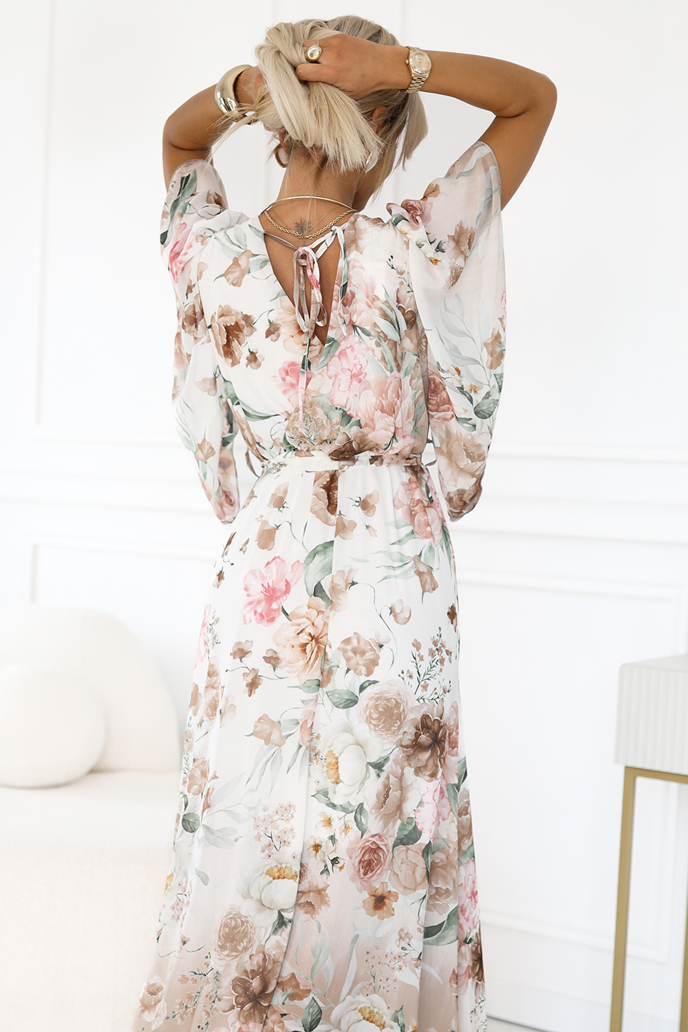 603-2 Rochie maxi vaporoasă, înfășurată, cu model floral - trandafiri bej
