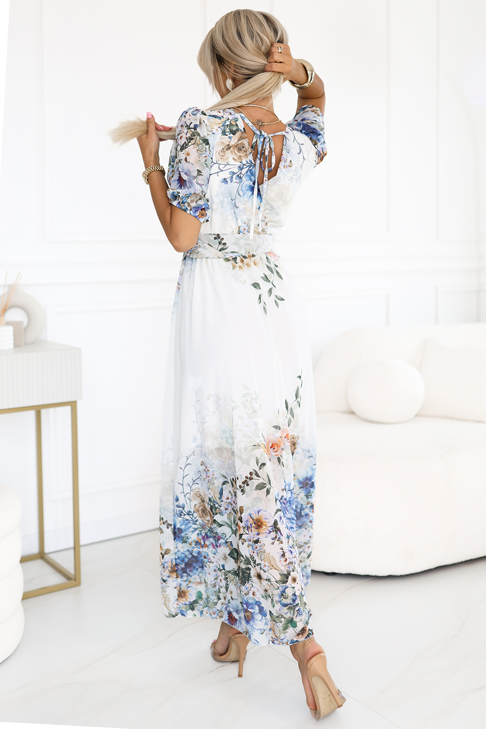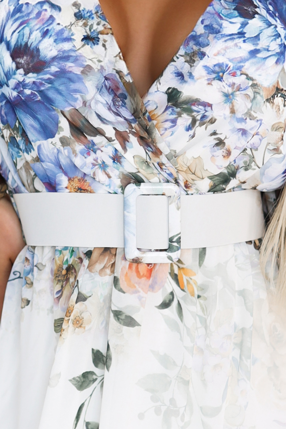 613-1 CELINA Rochie maxi vaporoasă cu decolteu tip plic, curea și model floral ombre - albastru deschis