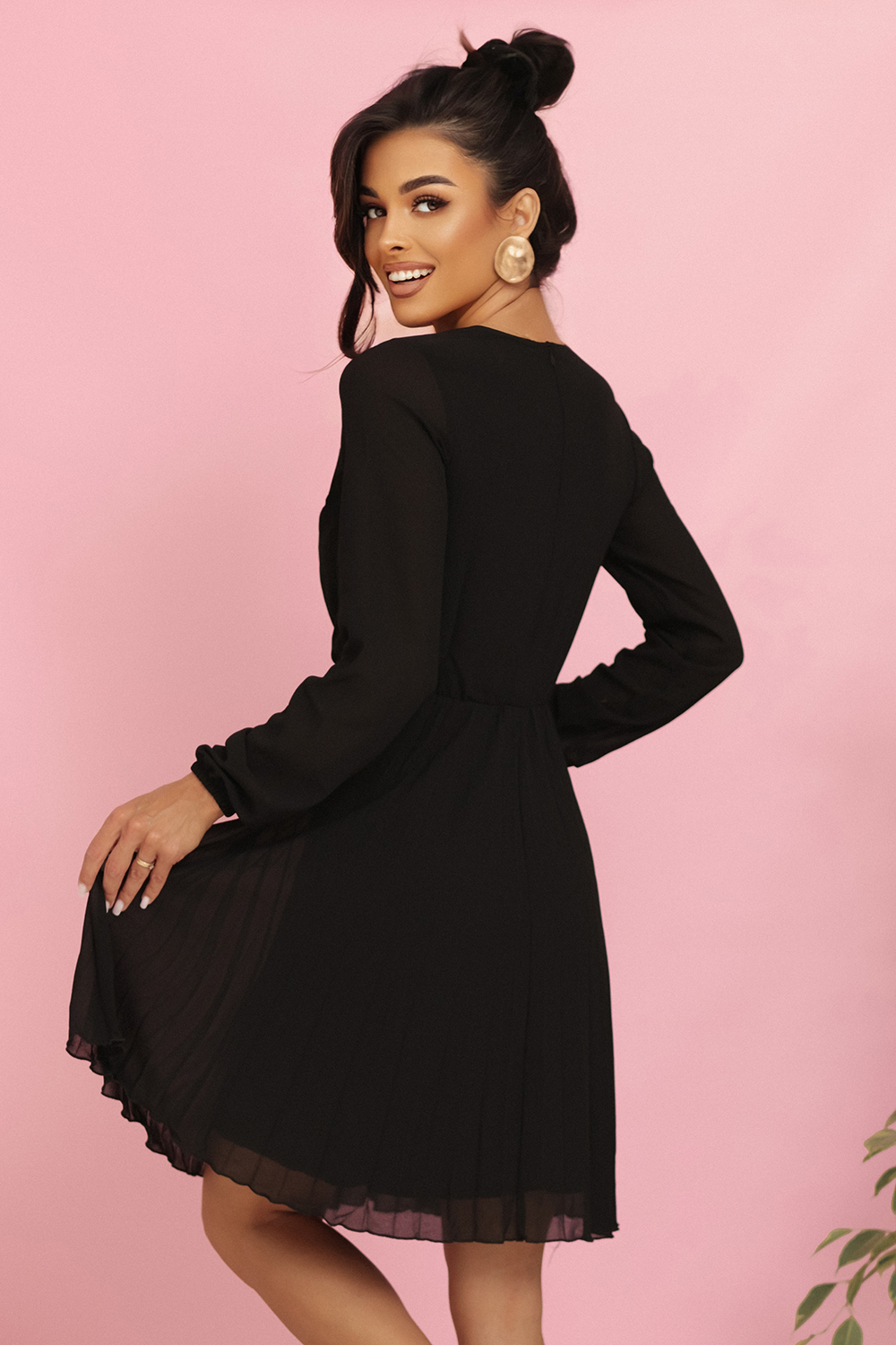 313-17 ISABELLE Rochie plisată poloneză cu mâneci lungi și decolteu - Negru