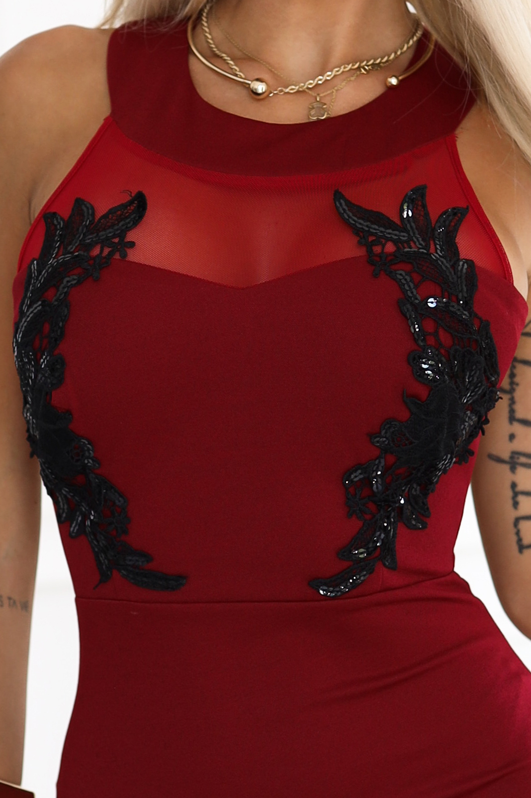 617-2 Rochie lungă tip sirenă cu dantelă neagră și plasă - vișinie
