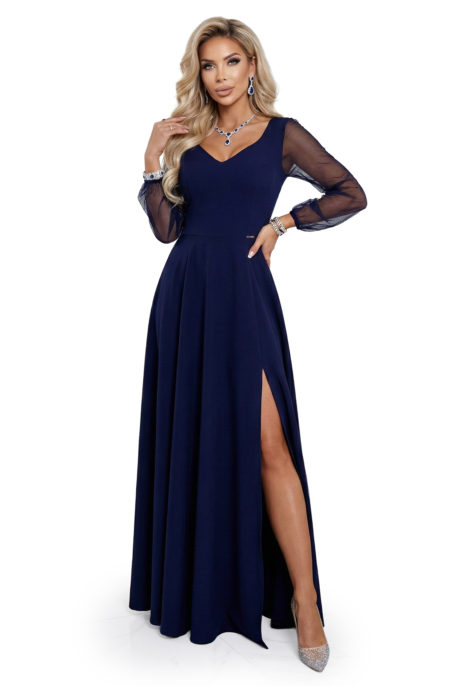 Elegantă rochie lungă maxi bleumarin cu mâneci din tul - clasic senzual de la Numoco